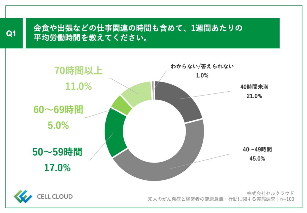 「Q1.会食や出張などの仕事関連の時間も含めて、1週間あたりの平均労働時間を教えてください。」(n=100)と質問したところ、「50~59時間」が17.0%、「60~69時間」が5.0%、「70時間以上」が11.0%という回答となりました。