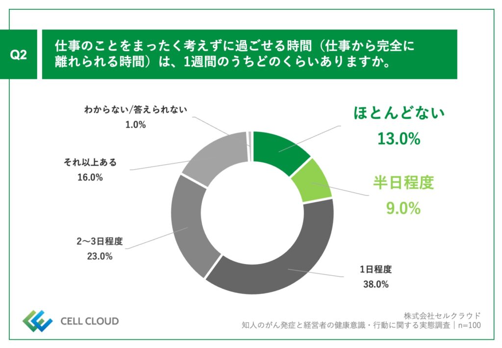 「Q2.仕事のことをまったく考えずに過ごせる時間(仕事から完全に離れられる時間)は、1週間のうちどのくらいありますか。」(n=100)と質問したところ、「ほとんどない」が13.0%、「半日程度」が9.0%という回答となりました。