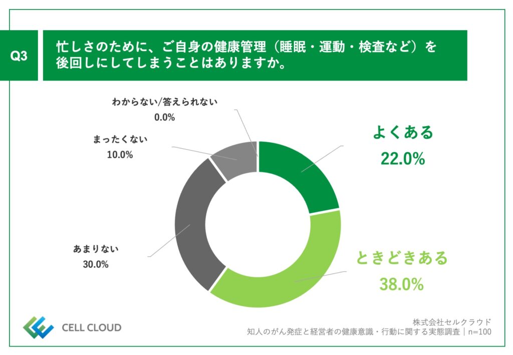 「Q3.忙しさのために、ご自身の健康管理(睡眠・運動・検査など)を後回しにしてしまうことはありますか。」(n=100)と質問したところ、「よくある」が22.0%、「ときどきある」が38.0%という回答となりました。