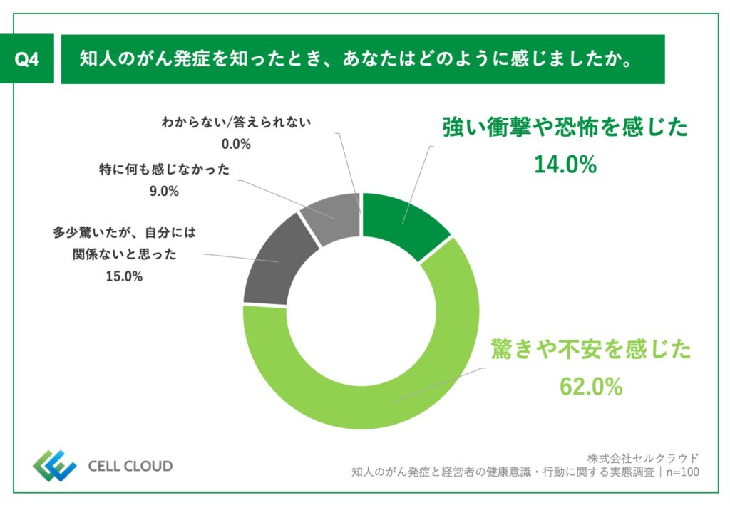 「Q4.知人のがん発症を知ったとき、あなたはどのように感じましたか。」(n=100)と質問したところ、「強い衝撃や恐怖を感じた」が14.0%、「驚きや不安を感じた」が62.0%という回答となりました。