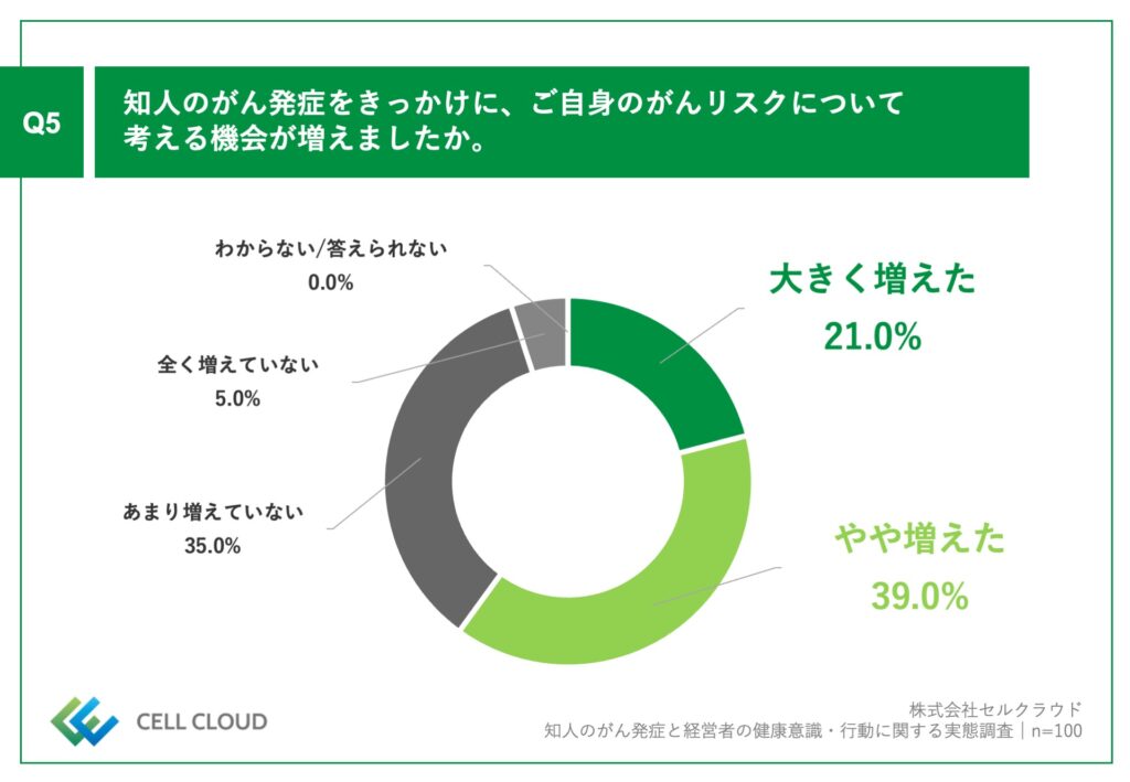 「Q5.知人のがん発症をきっかけに、ご自身のがんリスクについて考える機会が増えましたか。」(n=100)と質問したところ、「大きく増えた」が21.0%、「やや増えた」が39.0%という回答となりました。