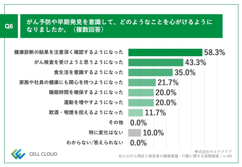 Q5で「大きく増えた」「やや増えた」と回答した方に、「Q6.がん予防や早期発見を意識して、どのようなことを心がけるようになりましたか。(複数回答)」(n=60)と質問したところ、「健康診断の結果を注意深く確認するようになった」が58.3%、「がん検査を受けようと思うようになった」が43.3%、「食生活を意識するようになった」が35.0%という回答となりました。