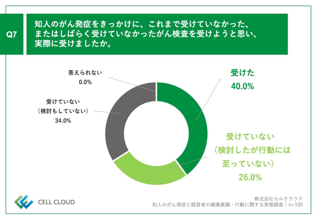 「Q7.知人のがん発症をきっかけに、これまで受けていなかった、またはしばらく受けていなかったがん検査を受けようと思い、実際に受けましたか。」(n=100)と質問したところ、「受けた」が40.0%、「受けていない(検討したが行動には至っていない)」が26.0%という回答となりました。