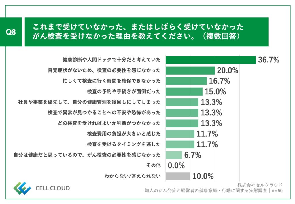 Q7で「受けていない(検討したが行動には至っていない)」「受けていない(検討もしていない)」と回答した方に、「Q8.これまで受けていなかった、またはしばらく受けていなかったがん検査を受けなかった理由を教えてください。(複数回答)」(n=60)と質問したところ、「健康診断や人間ドックで十分だと考えていた」が36.7%、「自覚症状がないため、検査の必要性を感じなかった」が20.0%、「忙しくて検査に行く時間を確保できなかった」が16.7%という回答となりました。