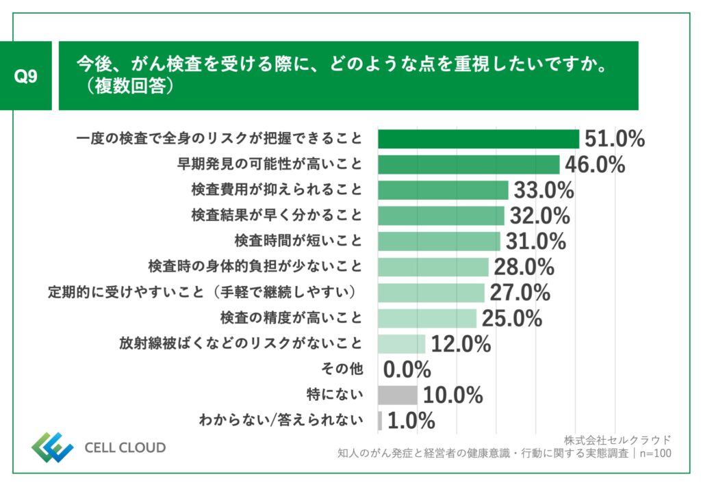 「Q9.今後、がん検査を受ける際に、どのような点を重視したいですか。(複数回答)」(n=100)と質問したところ、「一度の検査で全身のリスクが把握できること」が51.0%、「早期発見の可能性が高いこと」が46.0%、「検査費用が抑えられること」が33.0%という回答となりました。